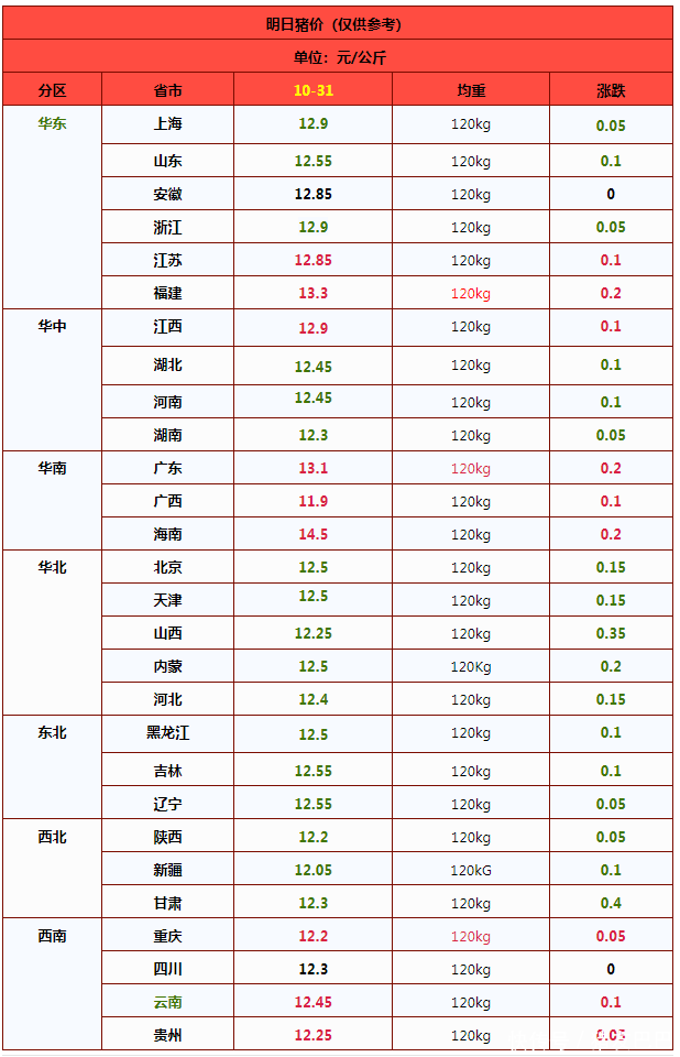 从最新消息了解,受屠宰场调价,10月31日,外三元瘦肉型标猪价格出栏均价在12.58元/公斤,市场以盘整震荡为主,北方地区报价转弱,后市关注生猪购销情绪的变化!
